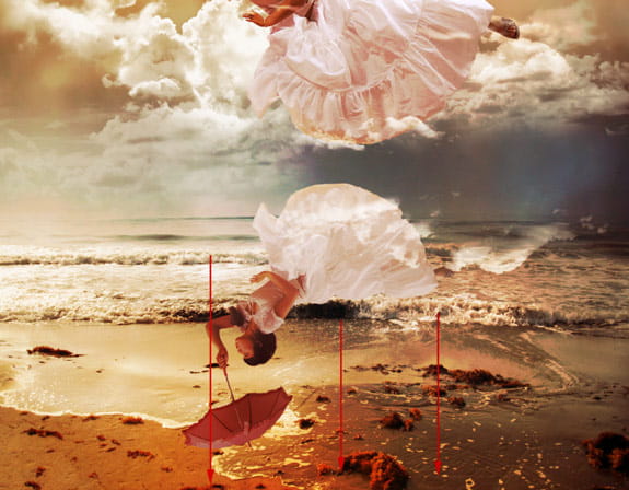Now we will create a reflection. Copy one of the girl layer and the clouds that are above the her. Flip the layers vertically, Edit > Transform > Flip Vertically. Scale the layers down about 75% and pull them down to the water level.