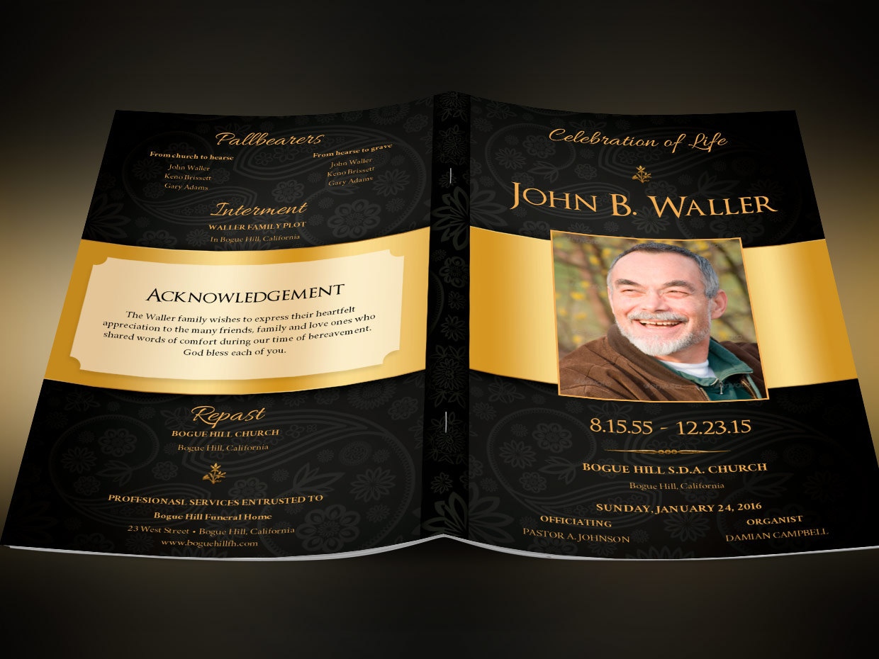 Black Gold Funeral Program Word Publisher Template is created in Microsoft Word and Publisher for a modern memorial or homegoing service. Its gold decals and text style laid over a black paisley background will honor and dignify your loved ones.