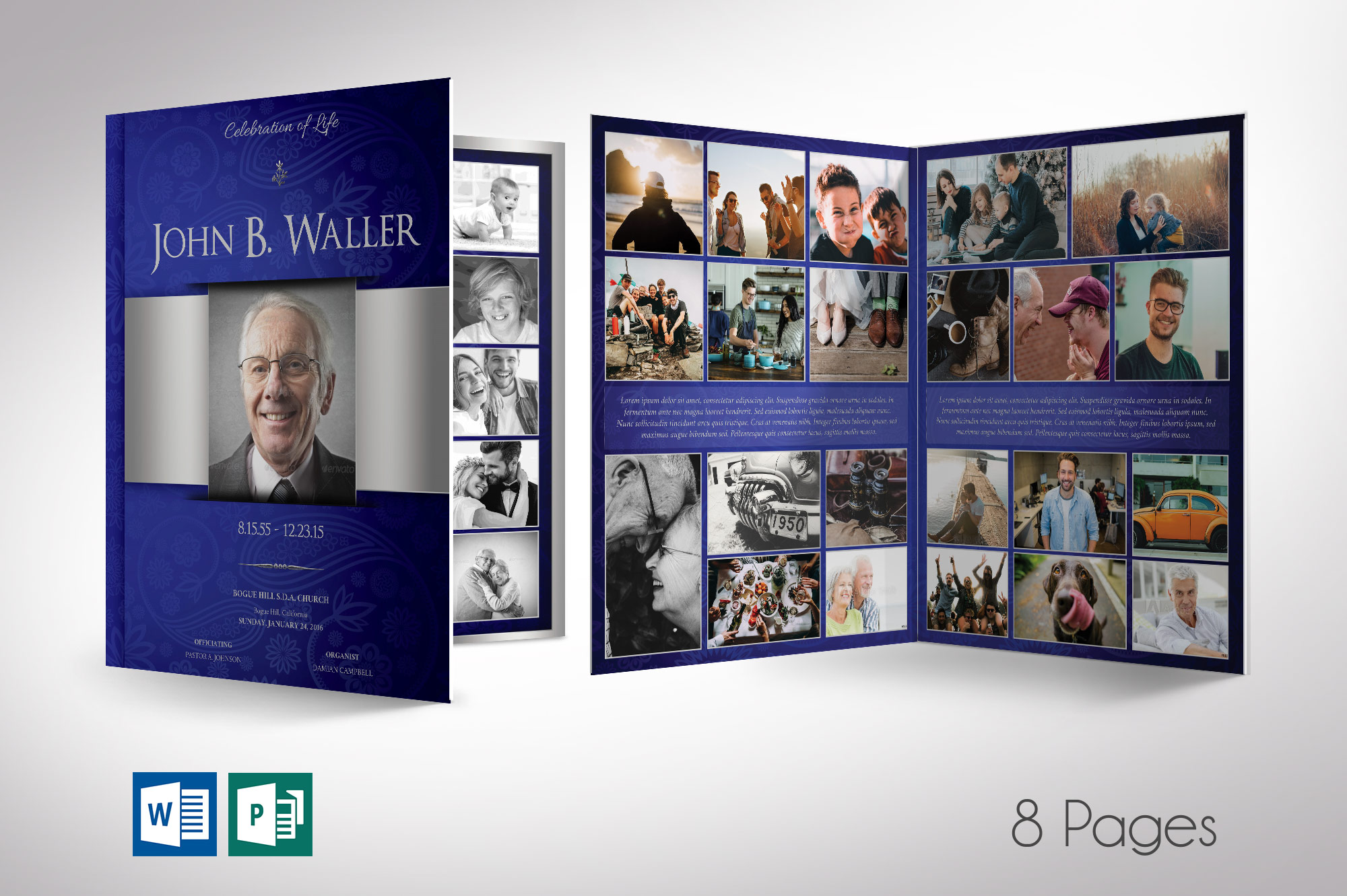 Blue Silver Tabloid Funeral Program Word Publisher Template – 8 Pages, Print Size: 11â€x17â€, Bi-Fold Size: 8.5â€x11â€, is a clean vintage memorial or funeral bi-fold brochure. Its silver decals and text style laid over a blue paisley texture will honor and dignify your loved ones. A great keepsake program.