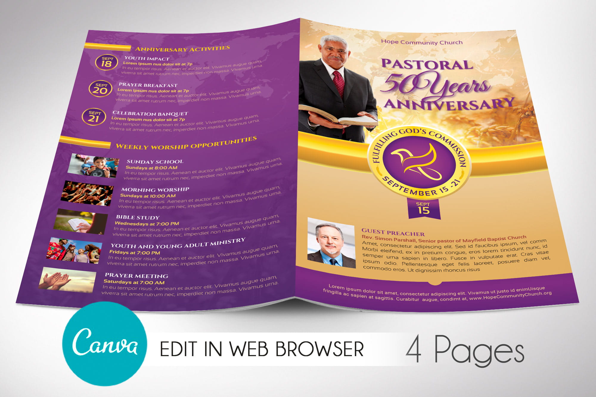Clergy Anniversary Program Canva Template, Print Sizes 11″x8.5″, Bifold Size 5.5″x8.5”, is for anniversary celebrations and appreciation events for church pastors. Can also be edited and used for pastor inaugurations, or funerals. The gold and purple colors used gives it a royal kingly theme that is attractive and elegant – perfect for all occasions. All the colors of this event program are editable on Canva.com.
