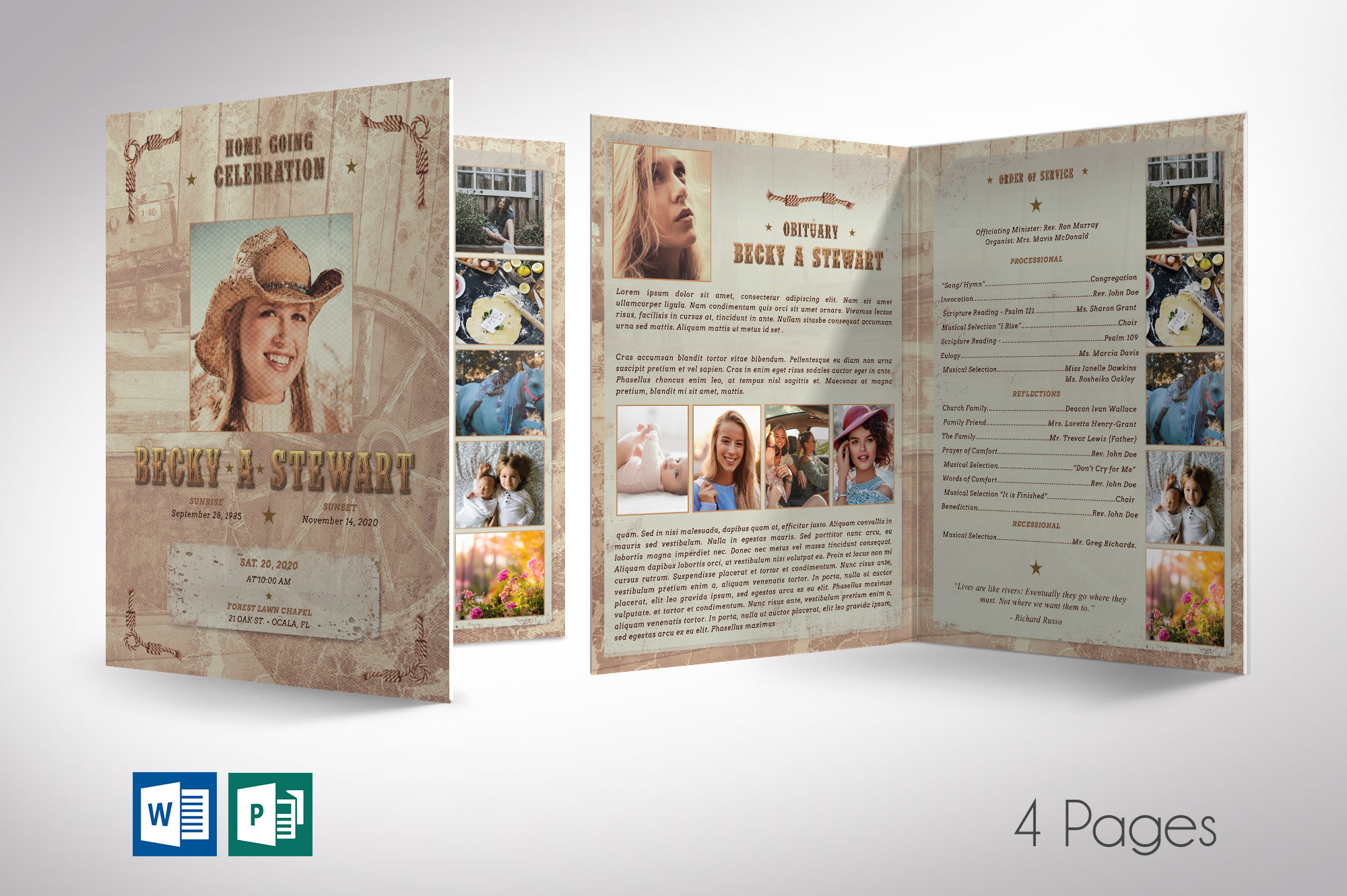 Cowgirl Tabloid Funeral Program Word Publisher Template, Print Size: 11″x17″, Bi-fold to 8.5â€x11†is for memorial or funeral services. Design with a grungy texture and a vintage country western composition. This Tabloid Funeral Program is great for memorial services with a Country Western theme. 16 Photos are used to showcase your loved one.