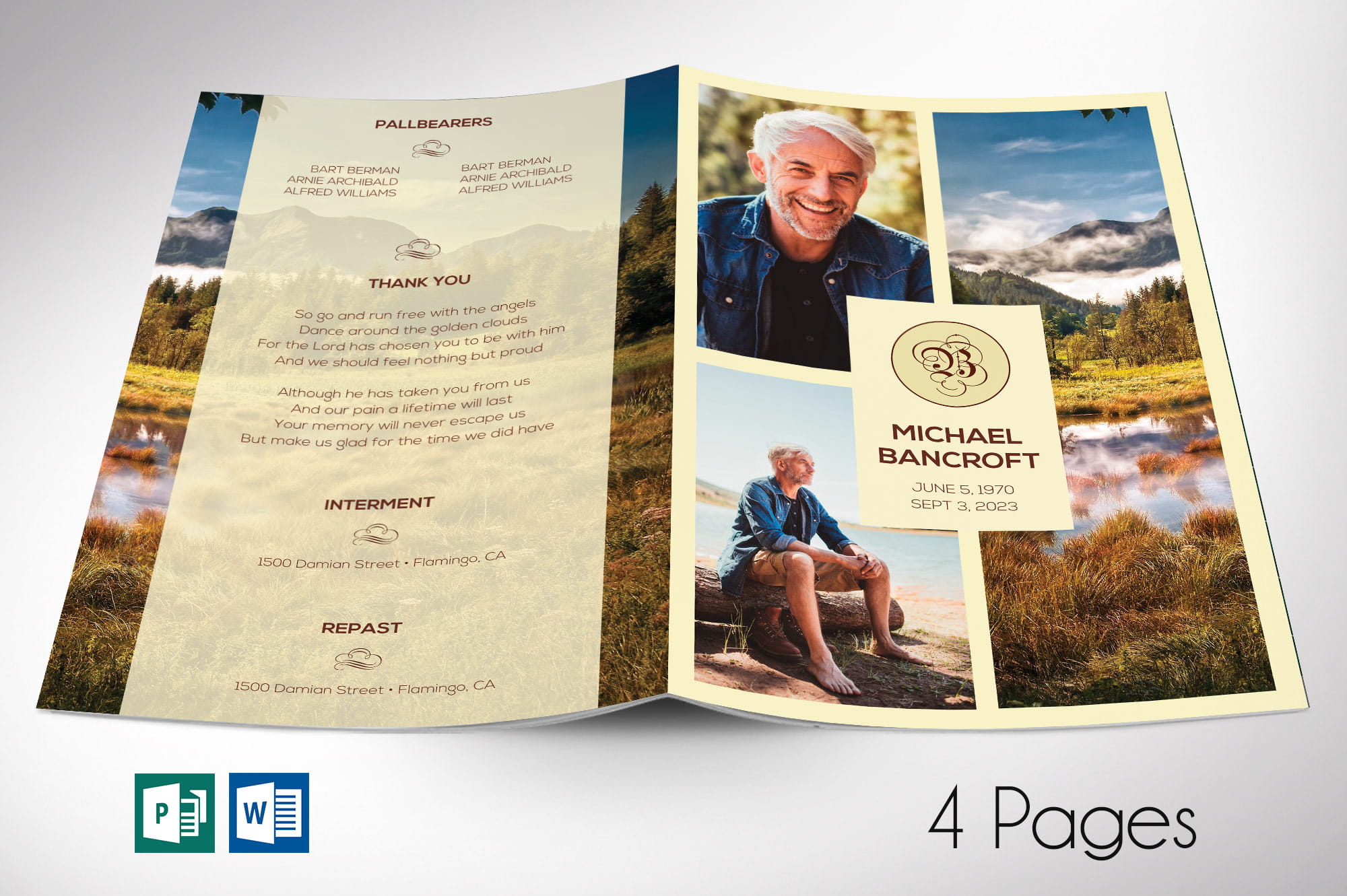 Nature Funeral Program Word Publisher Template V2, Print Size: 11”x8.5”, Bi-Fold Size: 5.5”x8.5”, is a modern memorial or homegoing service. It uses environmental images and earth tones. Great for both males and females. Change the images to match your loved one’s personality. A great keepsake program.