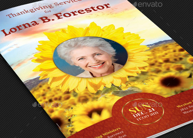 Sunflower Funeral Program Template is for a memorial or funeral services. The sunflower petals combined with clean serif text lends itself to many other occasions like weddings, anniversaries, baby showers etc. 4 color options are included for easy application.